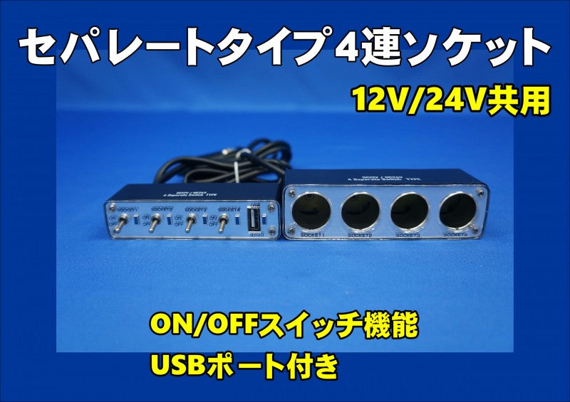 ON/OFFスイッチ機能付きセパレートタイプ4連ソケット USBポート付き 12V/24V共用