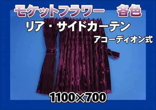 モケットフラワー アコーディオン式 リア・サイドカーテン テクノガレージ ■モケットフラワー ■サイド【リア】カーテン 2枚入り ■アコーディオン式 ■フック付き サイズ(現車にてサイズのご確認お願い致します。) 1100mm幅×700mm丈 本体カラー エンジ・ワイン・グリーン・グレー・チャコール・ブルー ・濃紺・ブラック・ブラウン・ゴールド・パープル 裏地色 なし・ブラック・エンジ・濃紺・ブラウン・ベージュ ※裏地付き・両面仕様は、キルトタイプになります。 ※受注製作商品の納期について 受注制作の為、代引き発送不可になります。 入金後のキャンセルはできません。 通常、製作期間は約4週間前後ですが、 メーカーが生地の在庫を欠品している場合、長期間お待たせすることがあります。 ※参考画像(仮眠カーテンとなります。) ※エンジ/裏地ブラック ※パープル/裏地無し ※グリーン/裏地無し ※グレー/裏地ブラック ※チャコール/裏地ブラック ※ブルー/裏地エンジ ※濃紺/裏地ブラック ※ブラック/裏地ブラック ※ブラウン/裏地ブラック ※パープル/裏地無し ※ゴールド/両面仕様価格 ¥13,000〜価格 ¥13,000〜 -